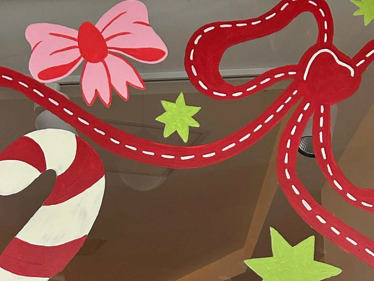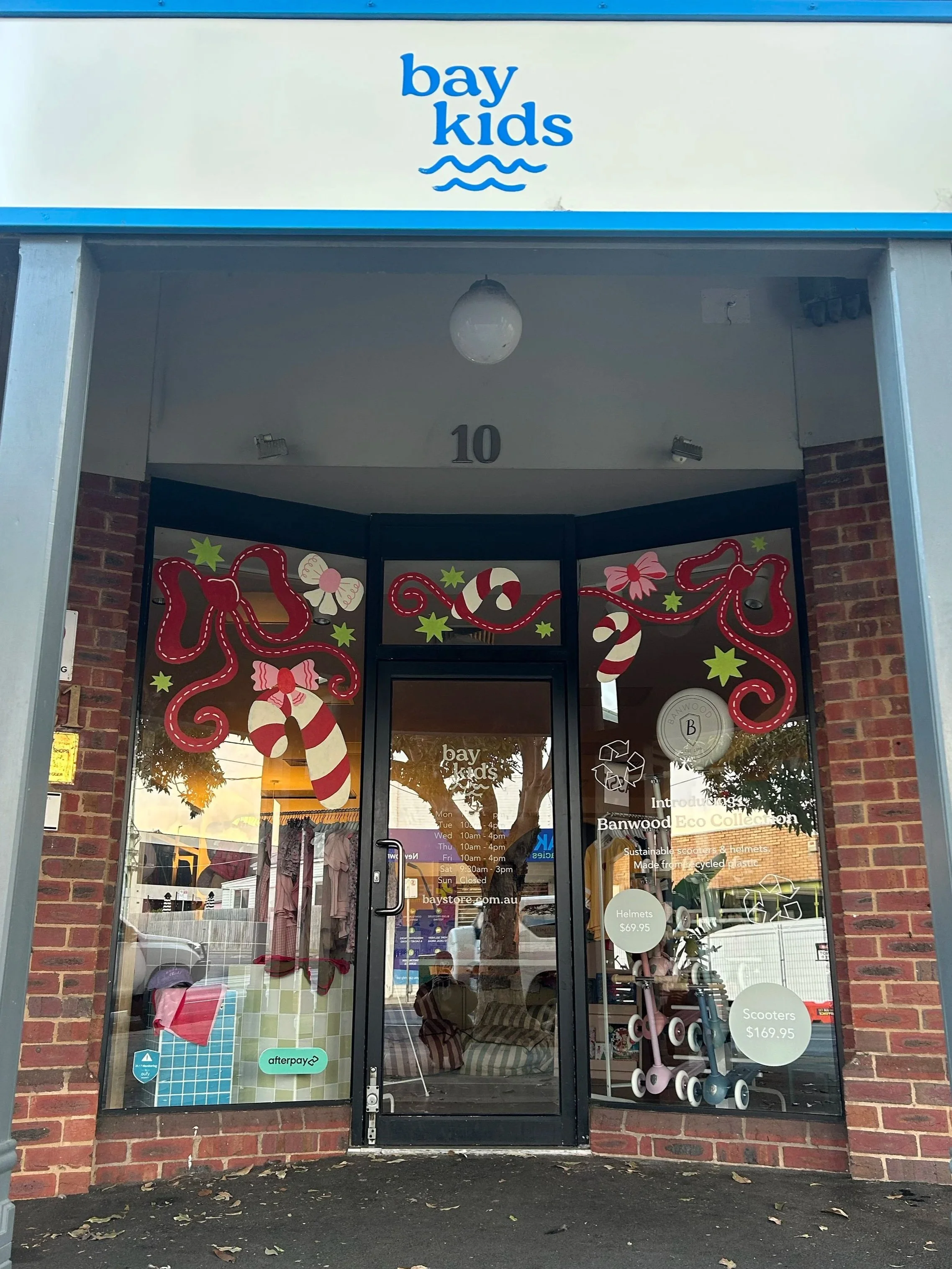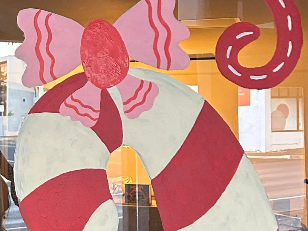 Hand-painted Christmas window signage that brought playful holiday cheer to this gorgeous kids’ clothing store on Pakington Street in Geelong. Featuring custom bows, candy canes, and stars in a bright palette that perfectly complemented the season’s collection.